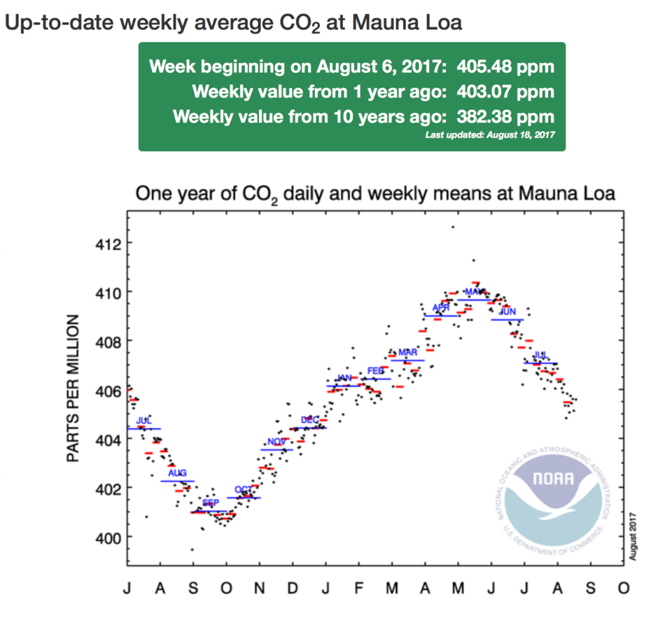 NOAA (National Oceanic and Atmospheric Administration:アメリカ海洋大気庁)のMauna Loa (マウナ ロア) 観測所 (ハワイ島) で測定されている最新の大気中のCO2濃度を知ることができます。Mauna Loa観測所は大都市から離れた太平洋上にあり、偏西風の影響もあり、大気中の平均的なCO2濃度を計測するのに適しています。